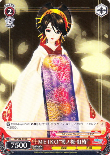 ![]() ![]() | PD/S22-070 MEIKO“零ノ桜・紅椿” キャラ ブースターパック 初音ミク -Project DIVA- f C 色:赤 レベル:2 コスト:2 パワー:7500 ソウル:2 特徴:音楽/和服 トリガー:ソウル 【永】他のあなたの「応援」を持つキャラがいるなら、このカードのパワーを+2000。 作品名:初音ミク -Project DIVA- f illust:Module Design:一斗まる |