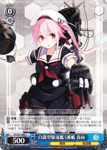 ![]() ![]() | KC/S31-089 白露型駆逐艦5番艦 春雨 キャラ ブースターパック 艦隊これくしょん -艦これ- 第二艦隊 C 色:青 レベル:0 コスト:0 パワー:500 ソウル:1 特徴:艦娘/駆逐艦 【永】応援 このカードの前のあなたのキャラすべてに、パワーを+500。 【自】[手札を1枚控え室に置く]このカードが手札から舞台に置かれた時、あなたはコストを払ってよい。そうしたら、あなたは自分の控え室の「ドラム缶(輸送用)」を1枚選び、手札に戻す。 これで・・・輸送任務が捗ります。 作品名:艦隊これくしょん -艦これ- |