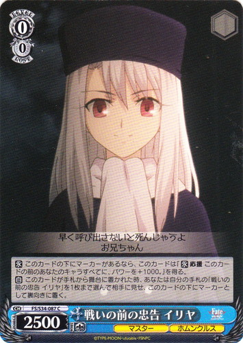 ![]() ![]() | FS/S34-087 戦いの前の忠告 イリヤ キャラ ブースターパック Fate/stay night Unlimited Blade Works C 色:青 レベル:0 コスト:0 パワー:2500 ソウル:1 特徴:マスター/ホムンクルス 【永】このカードの下にマーカーがあるなら、このカードは『【永】応援 このカードの前のあなたのキャラすべてに、パワーを+1000。』を得る。 【自】このカードが手札から舞台に置かれた時、あなたは自分の手札の「戦いの前の忠告 イリヤ」を1枚まで選んで相手に見せ、このカードの下にマーカーとして裏向きに置く。 早く呼び出さないと死んじゃうよ お兄ちゃん 作品名:Fate/stay night Unlimited Blade Works |