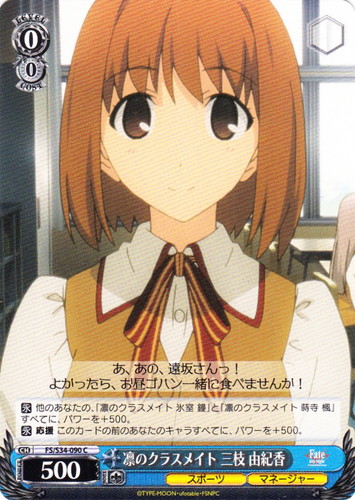 ![]() ![]() | FS/S34-090 凛のクラスメイト 三枝 由紀香 キャラ ブースターパック Fate/stay night Unlimited Blade Works C 色:青 レベル:0 コスト:0 パワー:500 ソウル:1 特徴:スポーツ/マネージャー 【永】他のあなたの「凛のクラスメイト 氷室 鐘」と「凛のクラスメイト 蒔寺 楓」すべてに、パワーを+500。 【永】応援 このカードの前のあなたのキャラすべてに、パワーを+500。 あ、あの、遠坂さんっ! よかったら、お昼ゴハン一緒に食べませんか! 作品名:Fate/stay night Unlimited Blade Works |