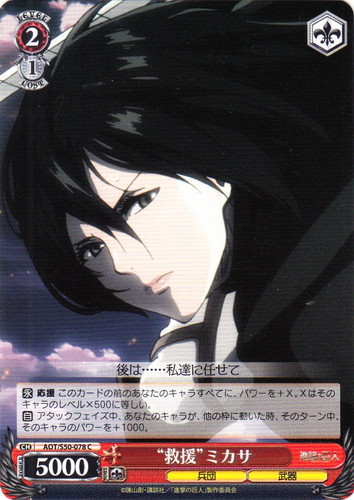 ![]() ![]() | AOT/S50-078 “救援” ミカサ キャラ ブースターパック 進撃の巨人 Vol.2 C 色:赤 レベル:2 コスト:1 パワー:5000 ソウル:1 特徴:兵団/武器 トリガー:ソウル 【永】応援 このカードの前のあなたのキャラすべてに、パワーを+X。Xはそのキャラのレベル×500に等しい。 【自】アタックフェイズ中、あなたのキャラが、他の枠に動いた時、そのターン中、そのキャラのパワーを+1000。 後は・・・・・・私達に任せて 作品名:進撃の巨人 |