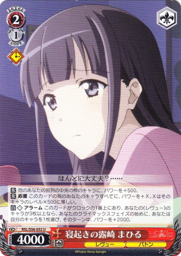 ![]() ![]() | RSL/S56-052 寝起きの露崎 まひる キャラ ブースターパック 少女☆歌劇 レヴュースタァライト U 色:赤 レベル:2 コスト:1 パワー:4000 ソウル:1 特徴:レヴュー/バトン トリガー:ソウル 【永】他のあなたの前列の中央の枠のキャラに、パワーを+500。 【永】応援 このカードの前のあなたのキャラすべてに、パワーを+X。Xはそのキャラのレベル×500に等しい。 【自動】アラーム このカードがクロックの1番上にあり、あなたの《レヴュー》のキャラが3枚以上なら、あなたのクライマックスフェイズの始めに、あなたは自分のキャラを1枚選び、そのターン中、パワーを+2000。 ほんとに大丈夫?・・・・・・ 作品名:少女☆歌劇 レヴュースタァライト |