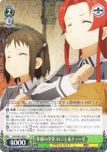 ![]() ![]() | SAO/S65-029 年頃の少女 ロニエ&ティーゼ キャラ ブースターパック ソードアート・オンライン アリシゼーション R 色:緑 レベル:2 コスト:1 パワー:4000 ソウル:1 特徴:フラクトライト/貴族 トリガー:ソウル 【永】応援 このカードの前のあなたのキャラすべてに、パワーを+X。Xはそのキャラのレベル×500に等しい。 【自】[①手札のクライマックスを1枚控え室に置いてよい]このカードが手札から舞台に置かれた時、あなたはコストを払ってよい。そうしたら、あなたは自分の控え室にクライマックスを1枚選び、手札に戻す。 【起】[このカードを「レスト」する]あなたは自分のカード名に「キリト」か「ユージオ」を含むキャラを1枚選び、そのターン中、パワーを+1500。 ロニエ「あ、ありがとうございます上級騎士どの!」 作品名:ソードアート・オンライン アリシゼーション |