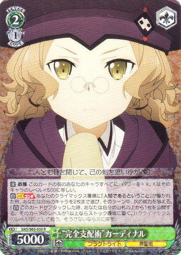 ![]() ![]() | SAO/S65-030 “完全支配術” カーディナル キャラ ブースターパック ソードアート・オンライン アリシゼーション R 色:緑 レベル:2 コスト:1 パワー:5000 ソウル:1 特徴:フラクトライト/神聖術 トリガー:ソウル 【永】応援 このカードの前のあなたのキャラすべてに、パワーを+X。Xはそのキャラのレベル×500に等しい。 【自】【CXコンボ】あなたのクライマックス置場に「人間であるということ」が置かれた時、あなたは自分のキャラを2枚まで選び、そのターン中、次の能力を与える。『【自】このカードがアタックした時、あなたは自分の山札の上から1枚を公開する。そのカードのレベルが1以上ならストック置場に置く。」(クライマックスのレベルは0として扱う。そうでないなら元に戻す) 二人とも目を閉じて、己の剣を思い浮かべよ 作品名:ソードアート・オンライン アリシゼーション |