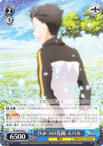 ![]() ![]() | RZ/S68-090 秘密の花園 スバル キャラ ブースターパック Re:ゼロから始める異世界生活 Memory Snow C 色:青 レベル:2 コスト:1 パワー:6500 ソウル:1 特徴:魔法/Memory Snow トリガー:ソウル 【永】応援 このカードの前のあなたのレベル3以上のキャラすべてに、パワーを+2000。 【自】【CXコンボ】[②]あなたのアタックフェイズの始めに、あなたのクライマックス置場にクライマックスがないなら、あなたはコストを払ってよい。そうしたら、あなたは自分の山札を見て「たどり着いた朝」を1枚まで選び、クライマックス置場に置き、その山札をシャッフルする。 エミリアたん! 作品名:Re:ゼロから始める異世界生活 Memory Snow |