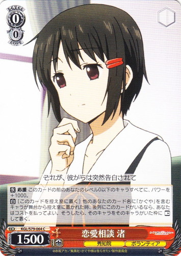 ![]() ![]() | KGL/S79-064 恋愛相談 渚 キャラ ブースターパック かぐや様は告らせたい~天才たちの恋愛頭脳戦~ C 色:赤 レベル:0 コスト:0 パワー:1500 ソウル:1 特徴:秀知院/ボランティア 【永】応援 このカードの前のあなたのレベル0以下のキャラすべてに、パワーを+1000。 【自】[このカードを控え室に置く]他のあなたのカード名に「かぐや」を含むキャラが舞台から控え室に置かれた時、後列にこのカードがいるなら、あなたはコストを払ってよい。そうしたら、そのキャラをそのキャラがいた枠に「レスト」して置く。 それが、彼からは突然告白されて 作品名:かぐや様は告らせたい~天才たちの恋愛頭脳戦~ |