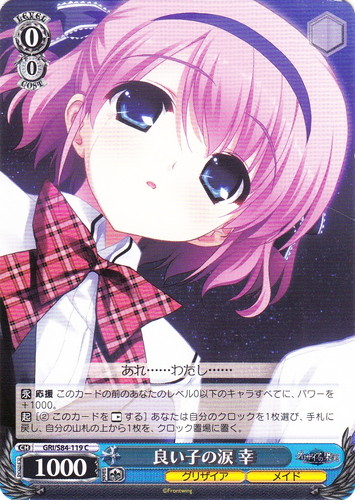 ![]() ![]() | LB/WE21-07 サーチング・ミステリー 理樹 キャラ エクストラブースター リトルバスターズ!カードミッション C 色:黄 レベル:1 コスト:0 パワー:2500 ソウル:1 【永】応援 あなたのターン中、このカードの前のあなたのキャラすべてに、パワーを+1000。 【自】あなたのキャラのトリガーチェックでクライマックスがでた時、あなたは自分のキャラを1枚選び、そのターン中、パワーを+2000。 真実を見つけに! 作品名:リトルバスターズ!カードミッション illust:ふゆいち |