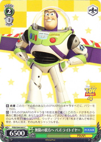 ![]() ![]() | PXR/S94-043 無限の彼方へ バズ・ライトイヤー キャラ ブースターパック PIXAR CHARACTERS C 色:緑 レベル:2 コスト:1 パワー:6500 ソウル:1 特徴:PIXAR トリガー:ソウル 【永】応援 このカードの前のあなたの《PIXAR》のキャラすべてに、パワーを+1500。 【自】[手札の《PIXAR》のキャラを1枚控え室に置く]このカードが手札から舞台に置かれた時、あなたはコストを払ってよい。そうしたら、あなたは自分の山札を見て「僕らはいける。 ウッディ・プライド」を1枚まで選んで相手に見せ、手札に加え、その山札をシャッフルする。 作品名:トイ・ストーリー4 |