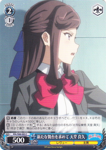 ![]() ![]() | RSL/S98-093 新たな舞台を求めて 天堂 真矢 キャラ ブースターパック 劇場版 少女☆歌劇 レヴュースタァライト C 色:青 レベル:2 コスト:1 パワー:500 ソウル:1 特徴:レヴュー/首席 トリガー:ソウル 【永】応援 このカードの前のあなたのキャラすべてに、パワーを+X。Xはそのキャラのレベル×500に等しい。 【起】[③このカードを「レスト」する]あなたは自分の手札の「壮烈な覚悟 天堂 真矢」を1枚まで選び、舞台の好きな枠に置く。 作品名:劇場版 少女☆歌劇 レヴュースタァライト |