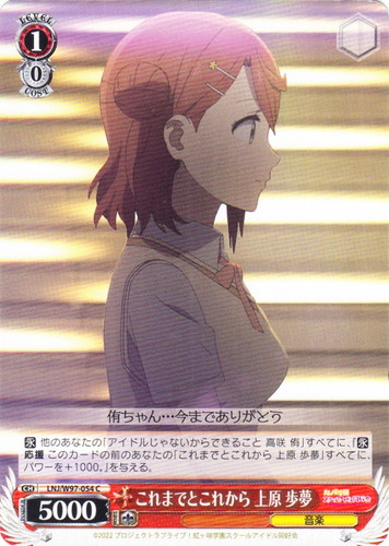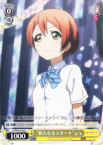 ![]() ![]() | LL/W24-015i “新たなるスタート” μ’s キャラ ブースターパック ラブライブ! C 色:黄 レベル:0 コスト:0 パワー:1000 ソウル:1 特徴:音楽 【永】応援 このカードの前のあなたのキャラすべてに、パワーを+500。 穂乃果「私たちのファーストライブは、この講堂でした」 作品名:ラブライブ! School idol project |