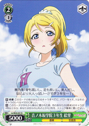 ![]() ![]() | LL/W24-031 音ノ木坂学院3年生 絵里 キャラ ブースターパック ラブライブ! R 色:緑 レベル:2 コスト:1 パワー:5000 ソウル:1 特徴:音楽/生徒会 トリガー:ソウル 【永】応援 このカードの前のあなたのキャラすべてに、パワーを+X。Xはそのキャラのレベル×500に等しい。 【自】このカードが手札から舞台に置かれた時、他のあなたの《音楽》のキャラが4枚以上なら、あなたは自分の山札の上から1枚を、ストック置場に置いてよい。 穂乃果「背も高いし、足も長いし、美人だし、なにより大人っぽい・・・さすが3年生・・・!」 作品名:ラブライブ! School idol project |