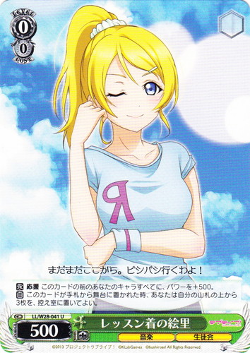 ![]() ![]() | LL/W28-041 レッスン着の絵里 キャラ ブースターパック ラブライブ! feat.スクールアイドルフェスティバル U 色:緑 レベル:0 コスト:0 パワー:500 ソウル:1 特徴:音楽/生徒会 【永】応援 このカードの前のあなたのキャラすべてに、パワーを+500。 【自】このカードが手札から舞台に置かれた時、あなたは自分の山札の上から3枚を、控え室に置いてよい。 まだまだこれから。ビシバシ行くわよ! 作品名:ラブライブ! School idol project |
