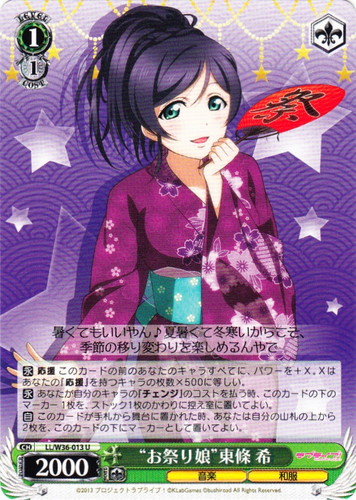 ![]() ![]() | LL/W36-013 “お祭り娘” 東條 希 キャラ ブースターパック ラブライブ! feat.スクールアイドルフェスティバル Vol.2 U 色:緑 レベル:1 コスト:1 パワー:2000 ソウル:1 特徴:音楽/和服 トリガー:ソウル 【永】応援 このカードの前のあなたのキャラすべてに、パワーを+X。Xはあなたの『応援』を持つキャラの枚数×500に等しい。 【永】あなたが自分のキャラの『チェンジ』のコストを払う時、このカードの下のマーカー1枚を、ストック1枚のかわりに控え室に置いてよい。 【自】このカードが手札から舞台に置かれた時、あなたは自分の山札の上から2枚を、このカードの下にマーカーとして置いてよ。 暑くてもいいやん♪夏暑くて冬寒いからこそ、季節の移り変わりを楽しめるんやで 作品名:ラブライブ! School idol project |