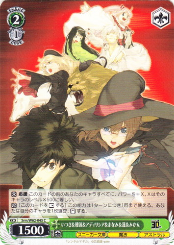 ![]() ![]() | Srm/W62-045 いつき&穂波&アディリシア&まなみ&蓮&みかん キャラ ブースターパック 角川スニーカー文庫 C 色:緑 レベル:2 コスト:1 パワー:1500 ソウル:1 特徴:スニーカー文庫/魔法/アストラル トリガー:ソウル 【永】応援 このカードの前のあなたのキャラすべてに、パワーを+X。Xはそのキャラのレベル×500に等しい。 【起】[このカードを「レスト」する]この能力は1ターンにつき1回まで使える。あなたは自分のキャラを1枚選び、「スタンド」する。 作品名:レンタルマギカ |