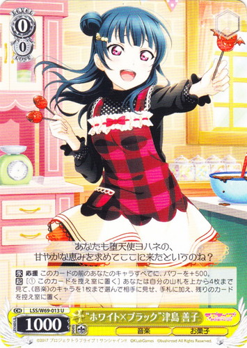 ![]() ![]() | LSS/W69-013 “ホワイト×ブラック” 津島 善子 キャラ ブースターパック ラブライブ!サンシャイン!! feat.スクールアイドルフェスティバル~6th Anniversary~ U 色:黄 レベル:0 コスト:0 パワー:1000 ソウル:1 特徴:音楽/お菓子 【永】応援 このカードの前のあなたのキャラすべてに、パワーを+500。 【起】[①このカードを控え室に置く]あなたは自分の山札を上から4枚まで見て、《音楽》のキャラを1枚まで選んで相手に見せ、手札に加え、残りのカードを控え室に置く。 あなたも堕天使ヨハネの、甘やかな恵みを求めてここに来たというのね? 作品名:ラブライブ!サンシャイン!! |