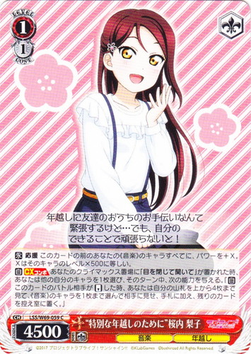 ![]() ![]() | LSS/W69-059A “特別な年越しのために” 桜内 梨子 キャラ ブースターパック ラブライブ!サンシャイン!! feat.スクールアイドルフェスティバル~6th Anniversary~ CA 色:赤 レベル:1 コスト:1 パワー:4500 ソウル:1 特徴:音楽/年越し トリガー:ソウル 【永】応援 このカードの前のあなたの《音楽》のキャラすべてに、パワーを+X。Xはそのキャラのレベル×500に等しい。 【自】【CXコンボ】あなたのクライマックス置場に「目を閉じて聞いて」が置かれた時、あなたは他の自分のキャラを1枚選び、そのターン中、次の能力を与える。『【自】このカードのバトル相手が「リバース」した時、あなたは自分の山札の上から4枚まで見て、《音楽》のキャラを1枚まで選んで相手に見せ、手札に加え、残りのカードを控え室に置く。』 あけましておめでとうございます。 今年も・・・・・・ううん、来年も再来年もずっとよろしくね♪ 作品名:ラブライブ!サンシャイン!! |