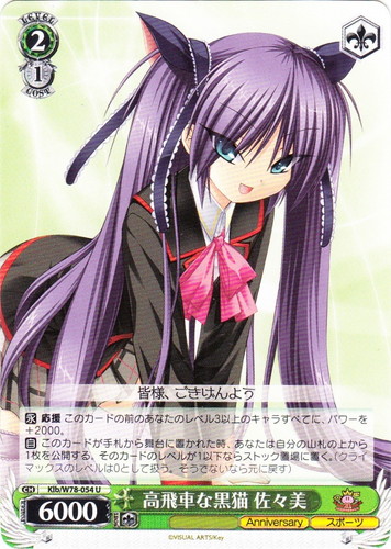 ![]() ![]() | Klb/W78-054 高飛車な黒猫 佐々美 キャラ ブースターパック Key 20th Anniversary U 色:緑 レベル:2 コスト:1 パワー:6000 ソウル:1 特徴:Anniversary/スポーツ トリガー:ソウル 【永】応援 このカードの前のあなたのレベル3以上のキャラすべてに、パワーを+2000。 【自】このカードが手札から舞台に置かれた時、あなたは自分の山札の上から1枚を公開する。そのカードのレベルが1以下ならストック置場に置く。(クライマックスのレベルは0として扱う。そうでないなら元に戻す) 皆様、ごきげんよう 作品名:リトルバスターズ! |