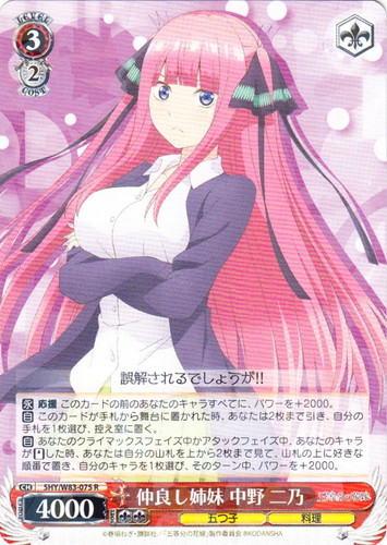 ![]() ![]() | 5HY/W83-035 仲良し姉妹 中野 四葉 キャラ ブースターパック 五等分の花嫁 R 色:緑 レベル:2 コスト:1 パワー:5000 ソウル:1 特徴:五つ子/リボン トリガー:ソウル 【永】応援 このカードの前のあなたのレベル3以上のキャラすべてに、パワーを+2000。 【自】【CXコンボ】[このカードを控え室に置く]あなたのクライマックス置場に「屈託ない笑顔」が置かれた時、あなたはコストを払ってよい。そうしたら、あなたは自分の手札の「多彩な魅力 中野 四葉」を1枚まで選び、このカードがいた枠に置く。 【自】あなたのキャラのトリガーチェックでトリガーアイコンが【トレジャー】のクライマックスが出た時、あなたは2枚引いてよい。そうしたら、あなたは自分の手札を2枚選び、控え室に置く。 早くしないと置いてっちゃいますよ 作品名:五等分の花嫁 |