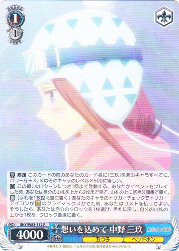 ![]() ![]() | 5HY/W83-112 想いを込めて 中野 三玖 キャラ ブースターパック 五等分の花嫁 R 色:青 レベル:1 コスト:1 パワー:4000 ソウル:1 特徴:五つ子/ヘッドホン トリガー:ソウル 【永】応援 このカードのあなたのカード名に「三玖」を含むキャラすべてに、パワーを+X。Xはそのキャラのレベル×500に等しい。 【自】この能力は1ターンにつき1回まで発動する。あなたがイベントをプレイした時、あなたは自分の山札を上から2枚まで見て、山札の上に好きな順番で置く。 【自】[手札を1枚控え室に置く]あなたのキャラのトリガーチェックでトリガーアイコンが【ゲート】のクライマックスがでた時、あなたはコストを払ってよい。そうしたら、あなたは自分のクロックを1枚選び、手札に戻し、自分の山札の上から1枚を、クロック置場に置く。 作品名:五等分の花嫁 |