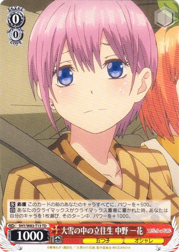 ![]() ![]() | 5HY/W83-T13 大雪の中の立往生 中野 一花 キャラ トライアルデッキ+ 五等分の花嫁 一花 TD 色:赤 レベル:0 コスト:0 パワー:1000 ソウル:1 特徴:五つ子/オシャレ 【永】応援 このカードの前のあなたのキャラすべてに、パワーを+500。 【自】あなたのクライマックスがクライマックス置場に置かれた時、あなたは自分のキャラを1枚選び、そのターン中、パワーを+1000。 作品名:五等分の花嫁 |