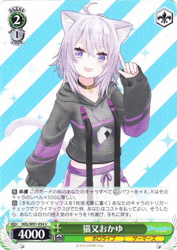 ![]() ![]() | HOL/WE44-33 Summer Splash Party! 赤井はあと キャラ プレミアムブースター ホロライブプロダクション Summer Collection N 色:赤 レベル:1 コスト:1 パワー:2000 ソウル:1 特徴:ホロライブ/1期生 トリガー:ソウル 【永】あなたのレベルが2以上なら、このカードは次の能力を得る。『【起】[①このカードを控え室に置く]あなたは自分の手札の「赤井はあと」を1枚まで選び、このカードがいた枠に置く。』 【永】応援 このカードの前のあなたの《ホロライブ》のキャラすべてに、パワーを+1000。 【起】[このカードを「レスト」する]あなたは自分の山札を上から2枚まで見て、山札の上に好きな順番で置く。 作品名:ホロライブプロダクション |