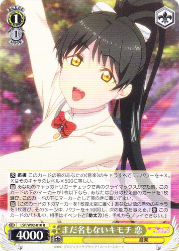 ![]() ![]() | LL/W24-015e “新たなるスタート” μ’s キャラ ブースターパック ラブライブ! C 色:黄 レベル:0 コスト:0 パワー:1000 ソウル:1 特徴:音楽 【永】応援 このカードの前のあなたのキャラすべてに、パワーを+500。 穂乃果「私たちのファーストライブは、この講堂でした」 作品名:ラブライブ! School idol project |