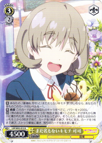 ![]() ![]() | LL/W24-015c “新たなるスタート” μ’s キャラ ブースターパック ラブライブ! C 色:黄 レベル:0 コスト:0 パワー:1000 ソウル:1 特徴:音楽 【永】応援 このカードの前のあなたのキャラすべてに、パワーを+500。 穂乃果「私たちのファーストライブは、この講堂でした」 作品名:ラブライブ! School idol project |