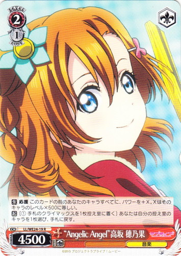 ![]() ![]() | LL/WE24-19 “Angelic Angel” 高坂 穂乃果 キャラ エクストラブースター ラブライブ! The School Idol Movie R 色:赤 レベル:2 コスト:1 パワー:4500 ソウル:1 特徴:音楽 トリガー:ソウル 【永】応援 このカードの前のあなたのキャラすべてに、パワーを+X。Xはそのキャラのレベル×500に等しい。 【起】[①手札のクライマックスを1枚控え室に置く]あなたは自分の控え室のキャラを1枚選び、手札に戻す。 作品名:ラブライブ! The School Idol Movie |