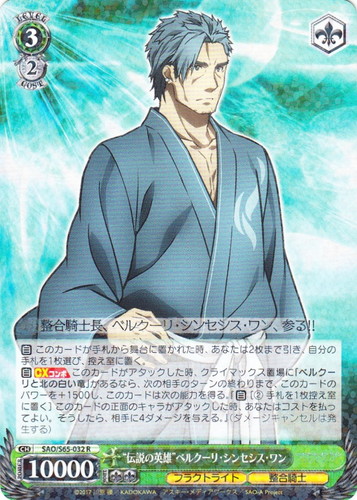 ![]() ![]() | SAO/S65-032 “伝説の英雄” ベルクーリ・シンセシス・ワン キャラ ブースターパック ソードアート・オンライン アリシゼーション R 色:緑 レベル:3 コスト:2 パワー:10000 ソウル:2 特徴:フラクトライト/整合騎士 トリガー:ソウル 【自】このカードが手札から舞台に置かれた時、あなたは2枚まで引き、自分の手札を1枚選び、控え室に置く。 【自】【CXコンボ】このカードがアタックした時、クライマックス置場に「ベルクーリと北の白い竜」があるなら、次の相手のターンの終わりまで、このカードのパワーを+1500し、このカードは次の能力を得る。『【自】[②手札を1枚控え室に置く]このカードの正面のキャラがアタックした時、あなたはコストを払ってよい。そうしたら、相手に4ダメージを与える。』(ダメージキャンセルは発生する) 整合騎士長、ベルクーリ・シンセシス・ワン、参る! 作品名:ソードアート・オンライン アリシゼーション |