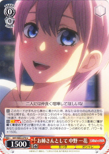![]() ![]() | 5HY/W90-085 持ち前の優しさ 中野 三玖 キャラ ブースターパック 五等分の花嫁∬ R 色:青 レベル:1 コスト:0 パワー:4500 ソウル:1 特徴:五つ子/ヘッドホン 【自】このカードがアタックした時、そのターン中、このカードのパワーを+X。Xはあなたの控え室の「ヘッドホン」の枚数×1500に等しい。 【自】【CXコンボ】このカードのバトル相手が「リバース」した時、あなたのクライマックス置場に「一途な想い」があるなら、あなたは自分の控え室のキャラを1枚選び、手札に戻してよい。 さみしくなったら呼んで、いつでも看病にくるから 作品名:五等分の花嫁∬ |