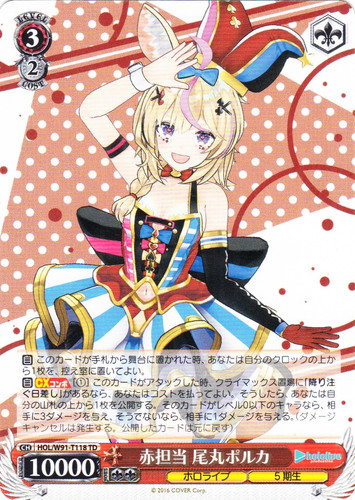 ![]() ![]() | HOL/W91-T118 赤担当 尾丸ポルカ キャラ トライアルデッキ+ ホロライブプロダクション ホロライブ5期生 TD 色:赤 レベル:3 コスト:2 パワー:10000 ソウル:2 特徴:ホロライブ/5期生 トリガー:ソウル 【自】このカードが手札から舞台に置かれた時、あなたは自分のクロックの上から1枚を、控え室に置いてよい。 【自】【CXコンボ】[①]このカードがアタックした時、クライマックス置場に「降り注ぐ日差し」があるなら、あなたはコストを払ってよい。そうしたら、あなたは自分の山札の上から1枚を公開する。そのカードがレベル0以下のキャラなら、相手に3ダメージを与え、そうでないなら、相手に1ダメージを与える。(ダメージキャンセルは発生する。公開したカードは元に戻す) 作品名:ホロライブプロダクション |
