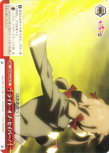 ![]() ![]() | KS/W55-076 ライト・オブ・セイバー! クライマックス ブースターパック この素晴らしい世界に祝福を!2 CR 色:赤 トリガー:カムバック 【永】あなたのキャラすべてに、パワーを+1000し、ソウルを+1。 (【カムバック】:このカードがトリガーした時、あなたは自分の控え室のキャラを1枚選び、手札に戻してよい) はあああっ! 作品名:この素晴らしい世界に祝福を!2 |