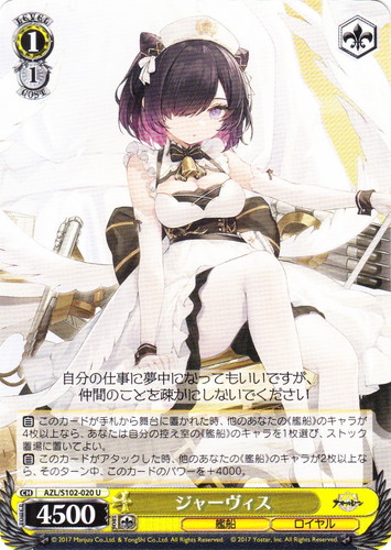 ![]() ![]() | AZL/S102-020 ジャーヴィス キャラ ブースターパック アズールレーン U 色:黄 レベル:1 コスト:1 パワー:4500 ソウル:1 特徴:艦船/ロイヤル トリガー:ソウル 【自】このカードが手札から舞台に置かれた時、他のあなたの《艦船》のキャラが4枚以上なら、あなたは自分の控え室の《艦船》のキャラを1枚選び、ストック置場に置いてよい。 【自】このカードがアタックした時、他のあなたの《艦船》のキャラが2枚以上なら、そのターン中、このカードのパワーを+4000。 自分の仕事に夢中になってもいいですが、仲間のことを疎かにしないでください 作品名:アズールレーン |