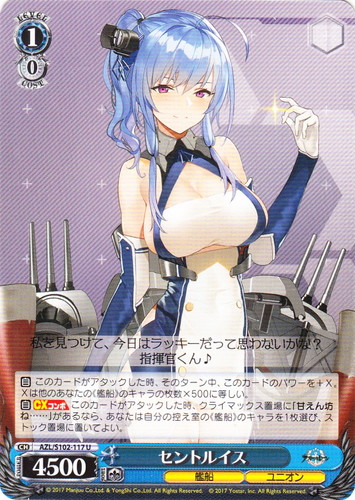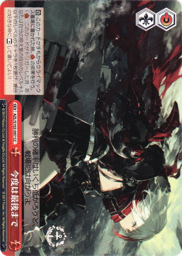 ![]() ![]() | AZL/S102-T61 Z1 キャラ トライアルデッキ アズールレーン ver.鉄血 TD 色:赤 レベル:0 コスト:0 パワー:500 ソウル:1 特徴:艦船/鉄血 【永】他のあなたの「Z2」すべてに、ソウルを+1。 【自】絆/「Z2」[①](このカードがプレイされて舞台に置かれた時、あなたはコストを払ってよい。そうしたら、あなたは自分の控え室の「Z2」を1枚選び、手札に戻す) 早くて強い!それがこの俺、Z1様だ! 作品名:アズールレーン |