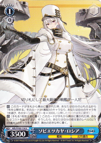 ![]() ![]() | AZL/S102-114 ソビエツカヤ・ロシア キャラ ブースターパック アズールレーン U 色:青 レベル:1 コスト:0 パワー:3500 ソウル:1 特徴:艦船/北方連合 【自】このカードが手札から舞台に置かれた時、あなたは自分の山札の上から1枚を公開する。そのカードが《艦船》のキャラなら、あなたは自分のキャラを1枚選び、そのターン中、パワーを+3000。(公開したカードは元に戻す) 【自】[手札を1枚控え室に置く]このカードが手札から舞台に置かれた時、あなたはコストを払ってよい。そうしたら、あなたは自分の控え室のレベル0以下の《艦船》のキャラを1枚選び、舞台の好きな枠に置く。 切り札にして最大最強の戦艦が一人だ 作品名:アズールレーン |