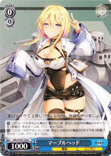 ![]() ![]() | AZL/S102-124 マーブルヘッド キャラ ブースターパック アズールレーン C 色:青 レベル:0 コスト:0 パワー:1000 ソウル:1 特徴:艦船/ユニオン 【自】このカードが手札から舞台に置かれた時、あなたは自分の《艦船》のキャラを1枚選び、そのターン中、パワーを+1500。 【自】このカードがアタックした時、あなたは自分の《艦船》のキャラを1枚選び、そのターン中、パワーを+1500。 あは☆イケてる感じです。いひひ、仲良くやりましょー 作品名:アズールレーン |