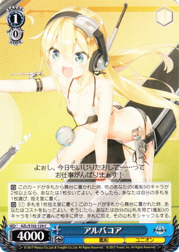 ![]() ![]() | AZL/S102-129 アルバコア キャラ ブースターパック アズールレーン C 色:青 レベル:1 コスト:0 パワー:4000 ソウル:1 特徴:艦船/ユニオン 【自】このカードが手札から舞台に置かれた時、他のあなたの《艦船》のキャラが2枚以上なら、あなたは1枚引いてよい。そうしたら、あなたは自分の手札を1枚選び、控え室に置く。 【自】[①手札を1枚控え室に置く]このカードが手札から舞台に置かれた時、あなたはコストを払ってよい。そうしたら、あなたは自分の山札を見て《艦船》のキャラを1枚まで選んで相手に見せ、手札に加え、その山札をシャッフルする。 よぉし、今日もいじりたおして・・・・・・って お仕事がんばりまぁす! 作品名:アズールレーン |