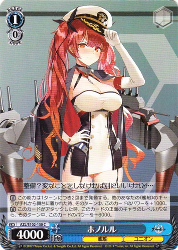 ![]() ![]() | AZL/S102-130 ホノルル キャラ ブースターパック アズールレーン C 色:青 レベル:1 コスト:0 パワー:4000 ソウル:1 特徴:艦船/ユニオン 【自】この能力は1ターンにつき2回まで発動する。他のあなたの《艦船》のキャラが手札から舞台に置かれた時、そのターン中、このカードのパワーを+1000。 【自】このカードがアタックした時、このカードの正面のキャラのレベルが2なら、そのターン中、このカードのパワーを+6000。 整備?変なことをしなければ別にいいけれど・・・・・・ 作品名:アズールレーン |