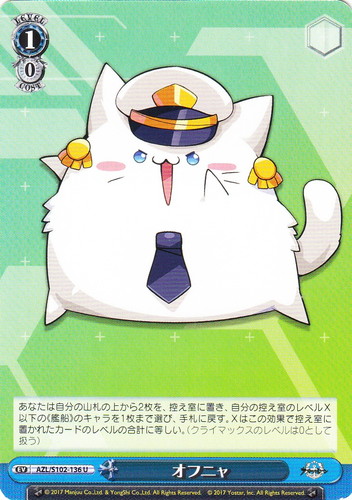 ![]() ![]() | AZL/S102-136 オフニャ イベント ブースターパック アズールレーン U 色:青 レベル:1 コスト:0 あなたは自分の山札の上から2枚を、控え室に置き、自分の控え室のレベルX以下の《艦船》のキャラを1枚まで選び、手札に戻す。Xはこの効果で控え室に置かれたカードのレベルの合計に等しい。(クライマックスのレベルは0として扱う) 作品名:アズールレーン |
