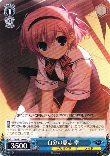 ![]() ![]() | GRI/S72-092 自分の意志 幸 キャラ ブースターパック グリザイアの果実 C 色:青 レベル:1 コスト:0 パワー:3500 ソウル:1 特徴:グリザイア/メイド 【永】相手の後列のキャラ1枚につき、このカードのパワーを+1500。 【自】アンコール [手札のキャラを1枚控え室に置く](このカードが舞台から控え室に置かれた時、あなたはコストを払ってよい。そうしたら、このカードがいた枠に「レスト」して置く) お父さんとお母さんの気持ちが知りたいです 作品名:グリザイアの果実 |