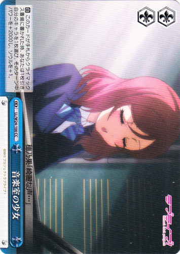 ![]() ![]() | LL/WE19-03 “それは僕たちの奇跡” 高坂 穂乃果 キャラ エクストラブースター ラブライブ! R 色:黄 レベル:1 コスト:0 パワー:5000 ソウル:1 特徴:音楽 【自】[①あなたの山札の上から1枚をクロック置場に置く]このカードがアタックした時、クライマックス置場に「どんなときもずっと」があるなら、あなたはコストを払ってよい。そうしたら、そのターン中、このカードのパワーを+7000し、相手は『【自】アンコール」を使えない。(ルールによる『【自】アンコール [③]』も使えない) 作品名:ラブライブ! School idol project |