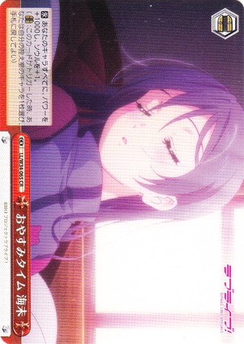 ![]() ![]() | LL/W24-006d “夏色えがおで1.2.Jump!” μ’s キャラ ブースターパック ラブライブ! R 色:黄 レベル:1 コスト:0 パワー:5000 ソウル:1 特徴:音楽 【自】[①]このカードがアタックした時、クライマックス置場に「Mermaid festa vol.1」があるなら、あなたはコストを払ってよい。そうしたら、あなたは自分の山札を見て《音楽》のキャラを1枚まで選んで相手に見せ、手札に加え、その山札をシャッフルする。 作品名:ラブライブ! School idol project |