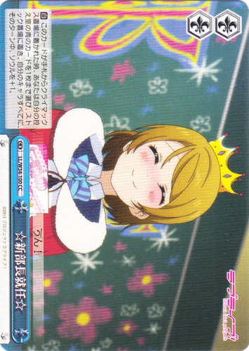 ![]() ![]() | SIL/W109-139 ミラクルライブ! 高坂 穂乃果 キャラ プロモーションカード ラブライブ!スクールアイドルフェスティバル2 MIRACLE LIVE! PR 色:赤 レベル:3 コスト:2 パワー:9500 ソウル:2 特徴:音楽 トリガー:ソウル 【永】他のあなたの《音楽》のキャラが2枚以上なら、このカードのパワーを+1000。 【自】【CXコンボ】[あなたのクライマックス置場に「春、輝いて」を1枚控え室に置く]あなたのアタックフェイズの始めに、他のあなたの《音楽》のキャラがいるなら、あなたはコストを払ってよい。そうしたら、このカードを「スタンド」し、次の相手のターンの終わりまで、このカードのパワーを+2000。 【自】[手札を1枚控え室に置く]このカードがアタックした時、あなたはコストを払ってよい。そうしたら、あなたは自分のクロックの上から1枚を、控え室に置く。 作品名:ラブライブ! School idol project |