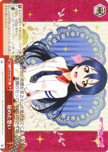 ![]() ![]() | LL/W36-064 秘めた想い クライマックス ブースターパック ラブライブ! feat.スクールアイドルフェスティバル Vol.2 CR 色:赤 トリガー:カムバック 【永】あなたのキャラすべてに、パワーを+1000し、ソウルを+1。 (【カムバック】:このカードがトリガーした時、あなたは自分の控え室のキャラを1枚選び、手札に戻してよい) あなたの笑顔を見ると、元気が出てくるんです。 笑顔の力って、すごいのですね 作品名:ラブライブ! School idol project |