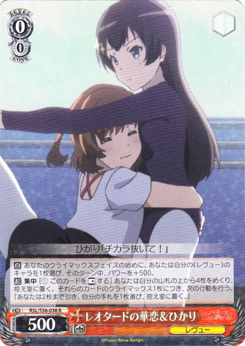 ![]() ![]() | RSL/S56-038 レオタードの華恋&ひかり キャラ ブースターパック 少女☆歌劇 レヴュースタァライト R 色:赤 レベル:0 コスト:0 パワー:500 ソウル:1 特徴:レヴュー 【自】あなたのクライマックスフェイズの始めに、あなたは自分の《レヴュー》のキャラを1枚選び、そのターン中、パワーを+500。 【起】集中 [①このカードを「レスト」する]あなたは自分の山札の上から4枚をめくり、控え室に置く。それらのカードのクライマックス1枚につき、次の行動を行う。『あなたは2枚まで引き、自分の手札を1枚選び、控え室に置く。』 ひかり「チカラ抜いて!」 作品名:少女☆歌劇 レヴュースタァライト |