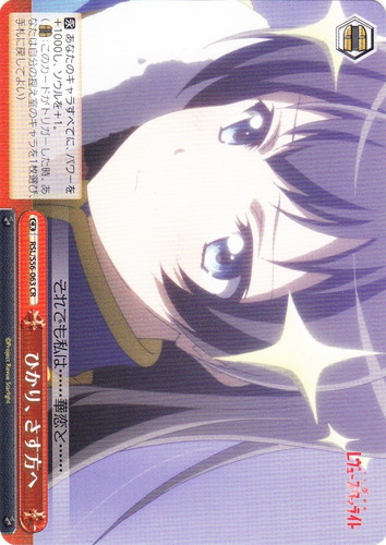 ![]() ![]() | RSL/S56-063 ひかり、さす方へ クライマックス ブースターパック 少女☆歌劇 レヴュースタァライト CR 色:赤 トリガー:カムバック 【永】あなたのキャラすべてに、パワーを+1000し、ソウルを+1。 (【カムバック】:このカードがトリガーした時、あなたは自分の控え室のキャラを1枚選び、手札に戻してよい) それでも私は・・・・・・華恋と・・・・・・ 作品名:少女☆歌劇 レヴュースタァライト |