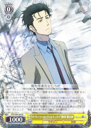 ![]() ![]() | STG/S60-011 “未来ガジェット研究所の創設者” 岡部 倫太郎 キャラ ブースターパック STEINS;GATE U 色:黄 レベル:0 コスト:0 パワー:1500 ソウル:1 特徴:ラボメン/科学 【永】あなたのターン中、このカードのパワーを+2000。 【自】【CXコンボ】[手札を2枚控え室に置く]あなたのクライマックス置場に「魔眼《リーディング・シュタイナー》」が置かれた時、あなたはコストを払ってよい。そうしたら、あなたは自分の控え室の、《ラボメン》のキャラか「Dメール」を2枚まで選び、手札に戻す。 未来ガジェット研究所の目標は世界の支配構造の変革にある。混沌に巻き込む発明を生み出すことだ 作品名:STEINS;GATE |