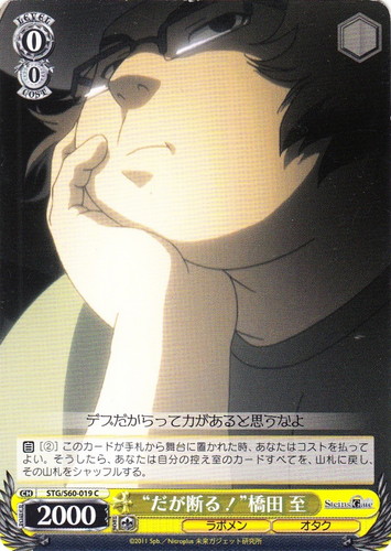 ![]() ![]() | STG/S60-019 “だが断る!” 橋田 至 キャラ ブースターパック STEINS;GATE C 色:黄 レベル:0 コスト:0 パワー:2000 ソウル:1 特徴:ラボメン/オタク 【自】[②]このカードが手札から舞台に置かれた時、あなたはコストを払ってよい。そうしたら、あなたは自分の控え室のカードすべてを、山札に戻し、その山札をシャッフルする。 デブだからって力があると思うなよ 作品名:STEINS;GATE |