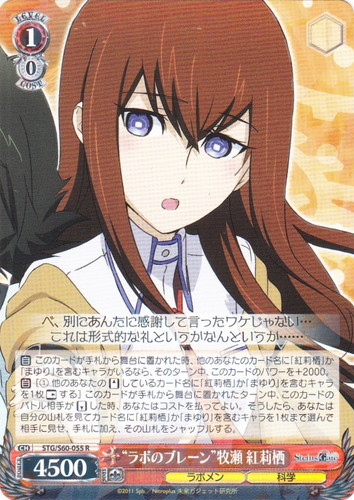 ![]() ![]() | STG/S60-055 “ラボのブレーン” 牧瀬 紅莉栖 キャラ ブースターパック STEINS;GATE R 色:赤 レベル:1 コスト:0 パワー:4500 ソウル:1 特徴:ラボメン/科学 【自】このカードが手札から舞台に置かれた時、他のあなたのカード名に「紅莉栖」か「まゆり」を含むキャラがいるなら、そのターン中、このカードのパワーを+2000。 【自】[①他のあなたの「スタンド」しているカード名に「紅莉栖」か「まゆり」を含むキャラを1枚「レスト」する]このカードが手札から舞台に置かれたターン中、このカードのバトル相手が「リバース」した時、あなたはコストを払ってよい。そうしたら、あなたは自分の山札を見てカード名に「紅莉栖」か「まゆり」を含むキャラを1枚まで選んで相手に見せ、手札に加え、その山札をシャッフルする。 べ、別にあんたに感謝して言ったワケじゃない・・・ これは形式的な礼というかなんというか・・・・・・ 作品名:STEINS;GATE |