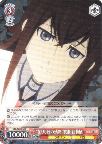 ![]() ![]() | STG/S60-058 “在りし日の残影” 牧瀬 紅莉栖 キャラ ブースターパック STEINS;GATE R 色:赤 レベル:3 コスト:2 パワー:10000 ソウル:2 特徴:ラボメン/科学 トリガー:ソウル 【永】他のあなたの《ラボメン》のキャラが2枚以上なら、このカードのパワーを+2000。 【自】このカードが手札から舞台に置かれた時、あなたは2枚まで引き、自分の手札を2枚選び、控え室に置き、自分の山札の上から1枚までを、ストック置場に置く。 私も・・・岡部のことが・・・・・・ 作品名:STEINS;GATE |
